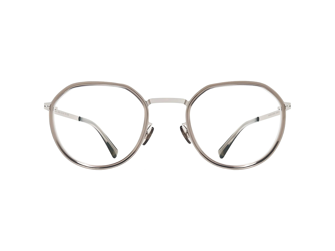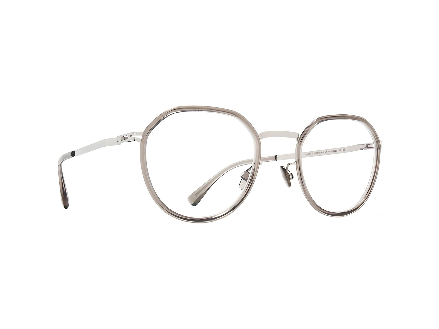 This pair of Mykita glasses comes in a silver/clear ash frame.